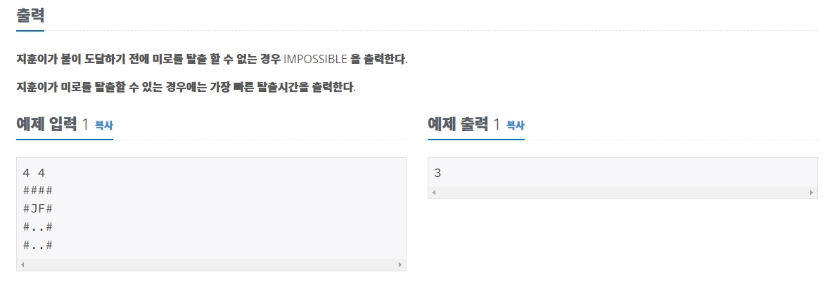처음에는 '지훈이는 미로의 가장자리에 접한 공간에서 탈출할 수 있다' 라는게 뭔말인지 이해가 안가서 지훈이쪽 bfs를 돌릴때 상하좌우에 갈곳이 없으면 탈출이 불가능 하다고 생각해 bool 값을 두고 실패를 판단했는데,