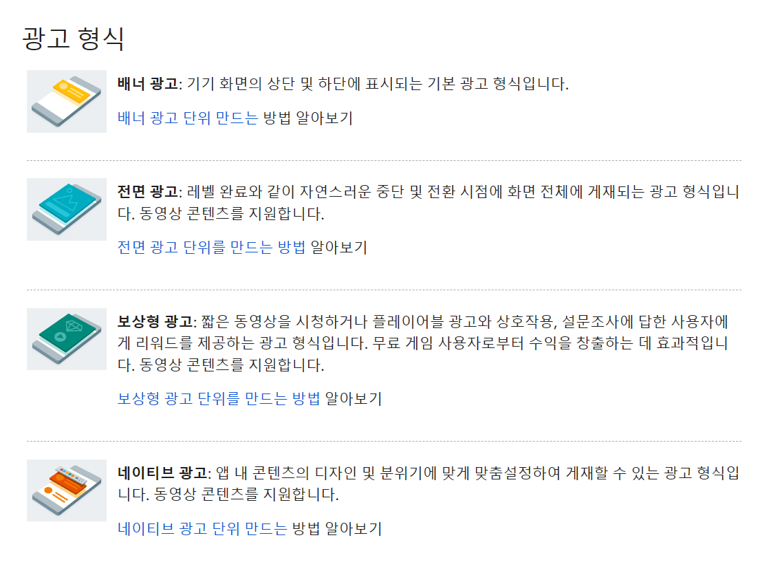 난 그중에서 일반적으로 사용하는 버튼을 눌러 광고를 보면 보상을 지급하는.. 그런 형식을 바랬기 때문에 보상형 광고로 테스트를 했다.