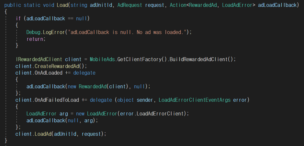 RewardedAd.Load 함수를 사용해서 로드를 시켜주는데,