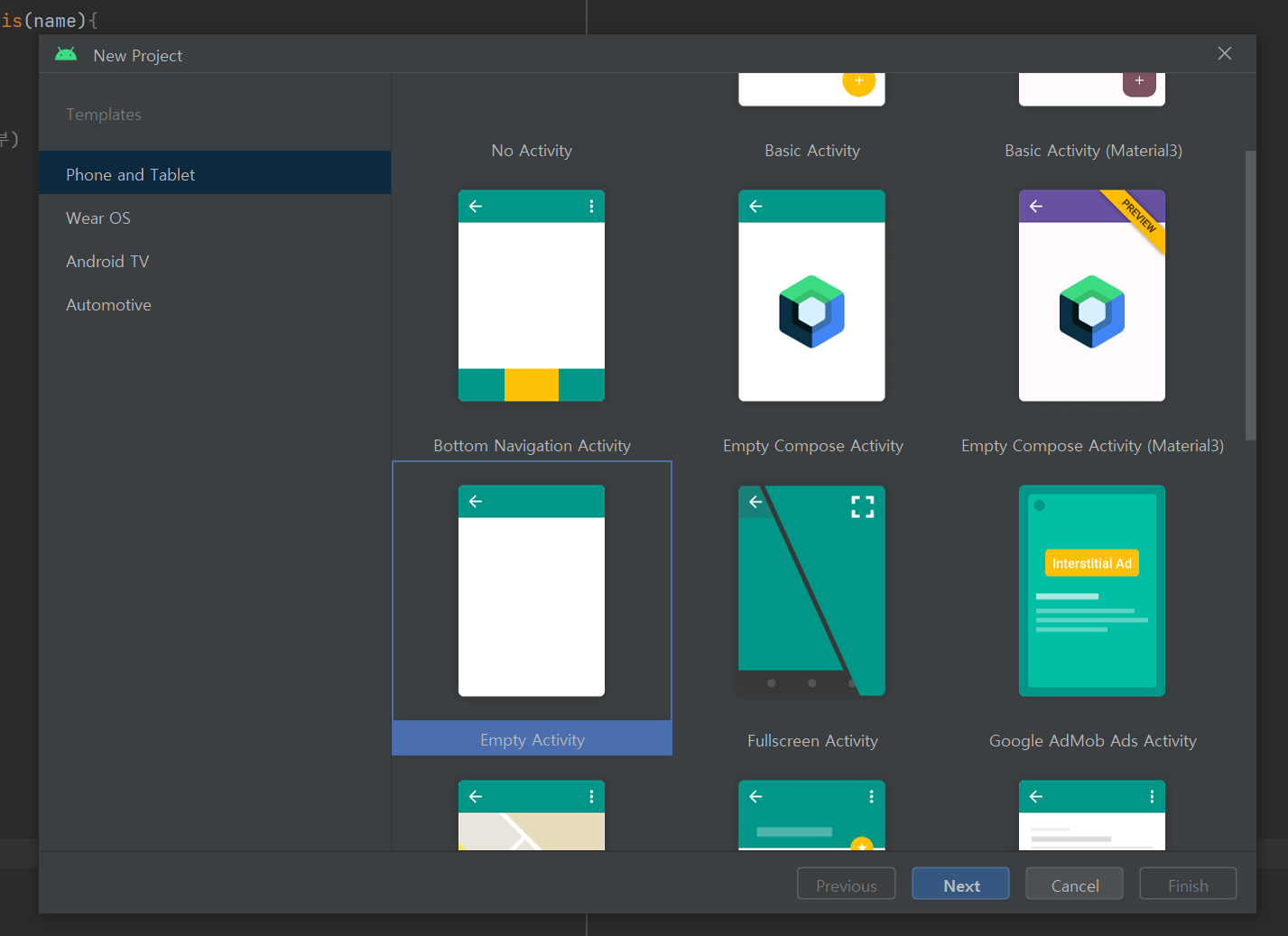 Empty Activity를 선택해서 프로젝트를 생성해주었다.
