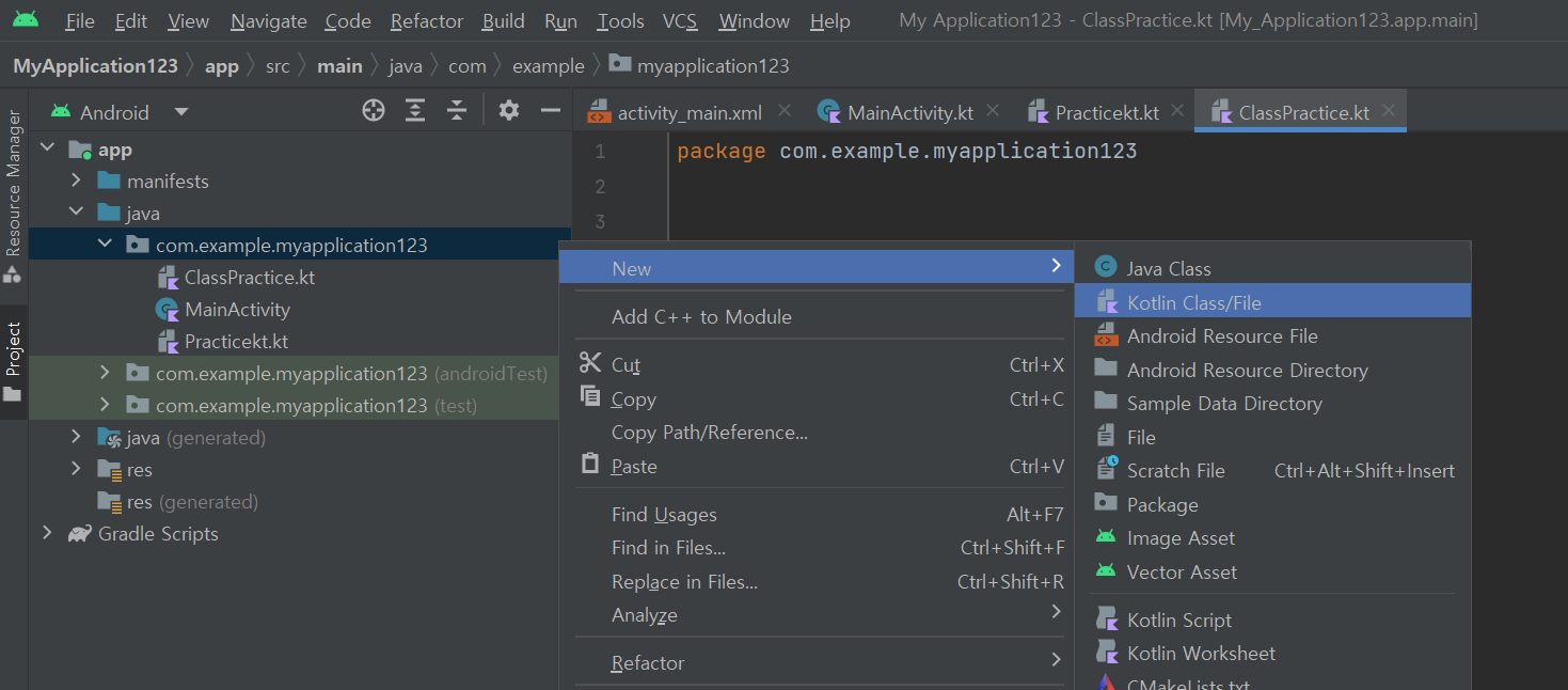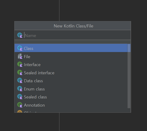 위 사진처럼 목록에서 오른쪽 클릭을하고 코틀린 파일을 선택해준다.
