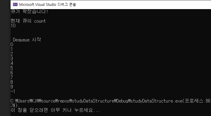 일부러 반복을 max보다 많은 11번을 반복했는데, 큐가 꽉차서 삽입되지 않는다는 메세지가 잘 뜨는것을 알 수 있다.