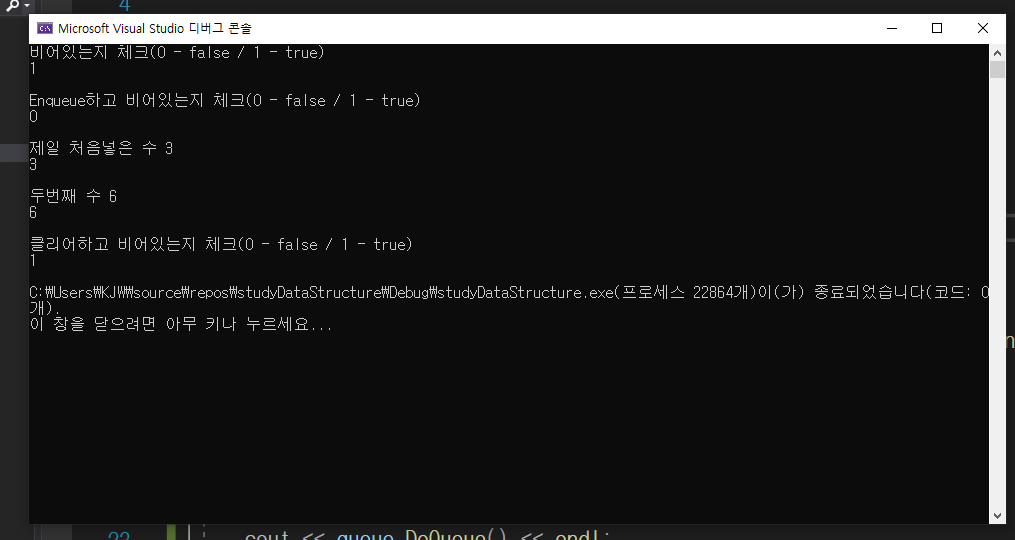 cout << "\nEnqueue하고 비어있는지 체크(0 - false / 1 - true)" << endl;