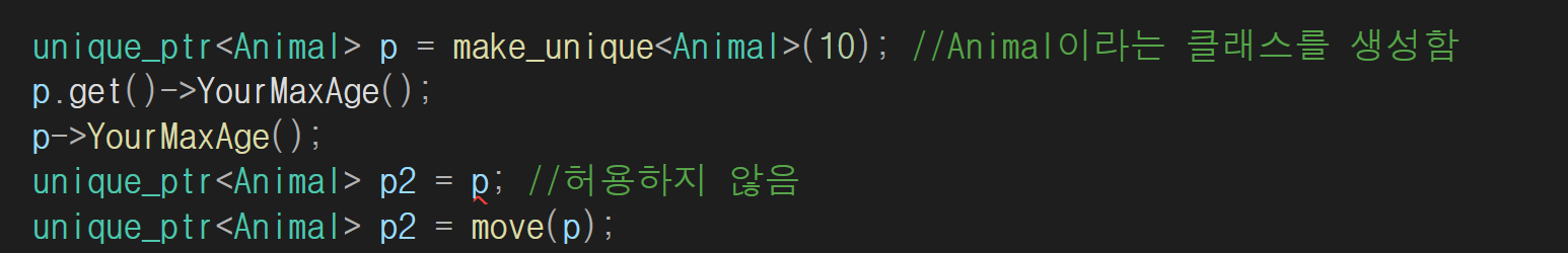 unique_ptr<Animal> p = make_unique<Animal>(10); //Animal이라는 클래스를 생성함
