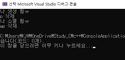 위 설명과 같이 p삭제가 출력 되고나서 소멸자가 호출되고 wp삭제가 출력 됐다.