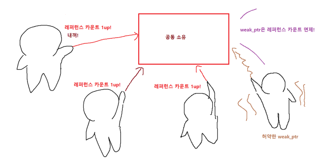 weak_ptr의 참조는 레퍼런스 카운트에 영향을 주지 못한다.