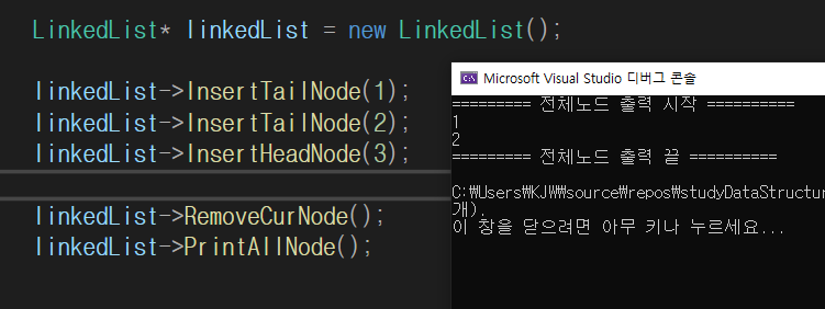 위 조건에 걸리지 않았다면 tempNode변수에 헤드 노드(첫번째 노드)를 넣고 끝까지 반복하면서 NextNode가 CurNode인 경우를 찾아준다.