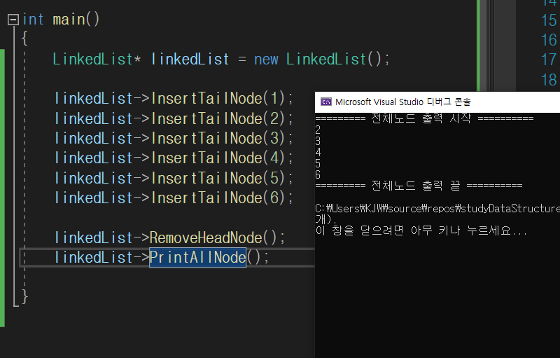만약 다음 노드가 있다면 그 노드를 헤드노드와 현재 노드로 만들어주고 지워버렸다.