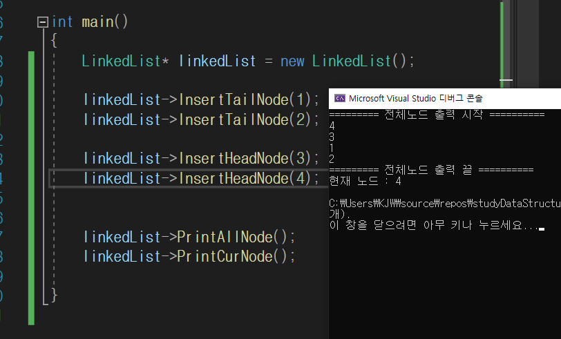 순서대로 잘 나오고, 현재 노드 = 마지막 헤드 삽입(4) 까지 잘 나온다.