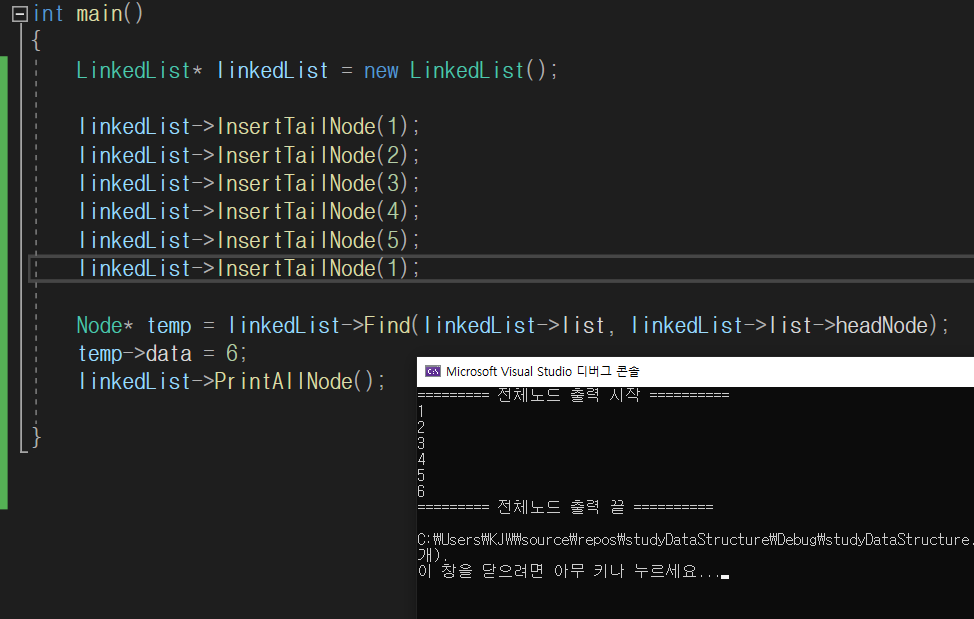 첫번째 노드(1) 과 같은 값을 탐색해서 6으로 바꿔주었다.