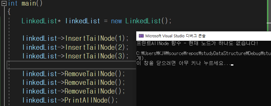 std::cout << "RemoveTailNode 함수 - 현재 노드가 하나도 없습니다!" << std::endl;