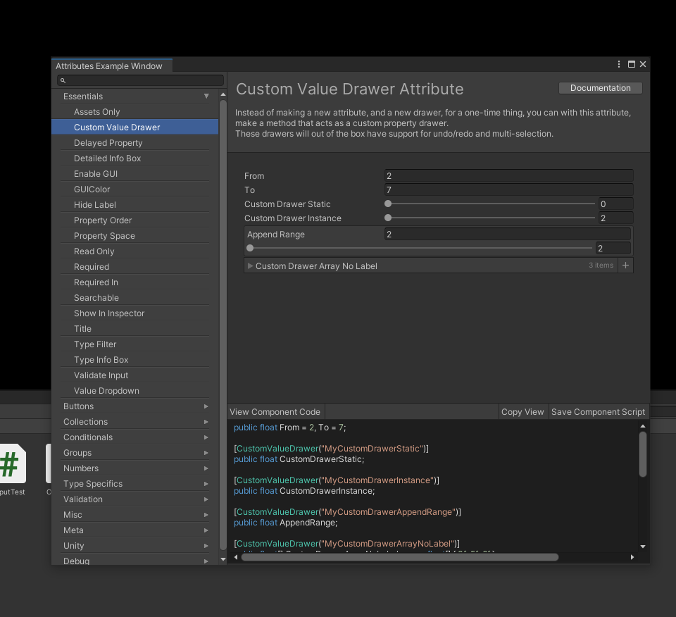 여러가지 Attribute들을 코드와 그 코드를 입력했을때 인스펙터에 어떻게 표현되는지까지 확인이 가능하다.