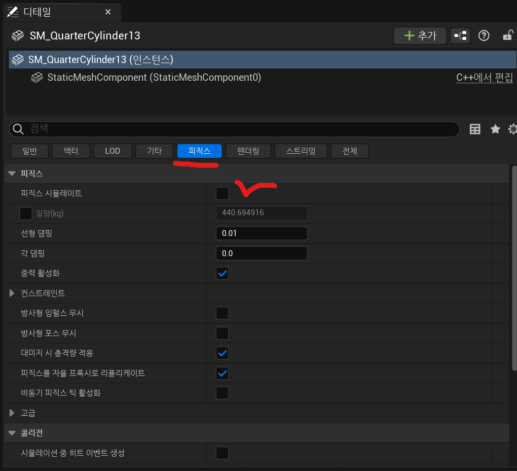 해당 액터를 클릭하고, 디테일을 살펴보면 피직스라는 메뉴가 있다.