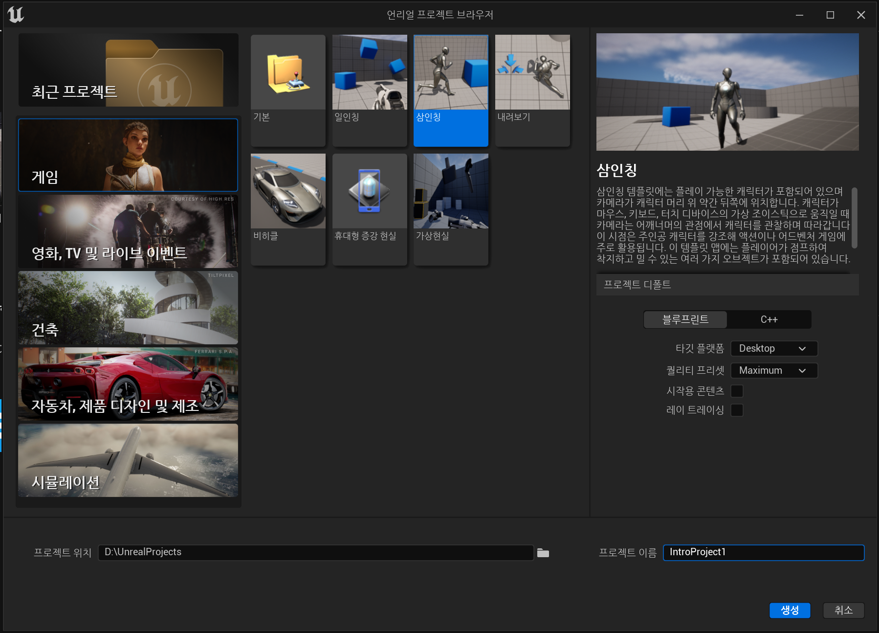 오른쪽 설정 창에서는 블루프린트와 C++을 선택할 수 있고, 다른 설정들도 가능하다.
