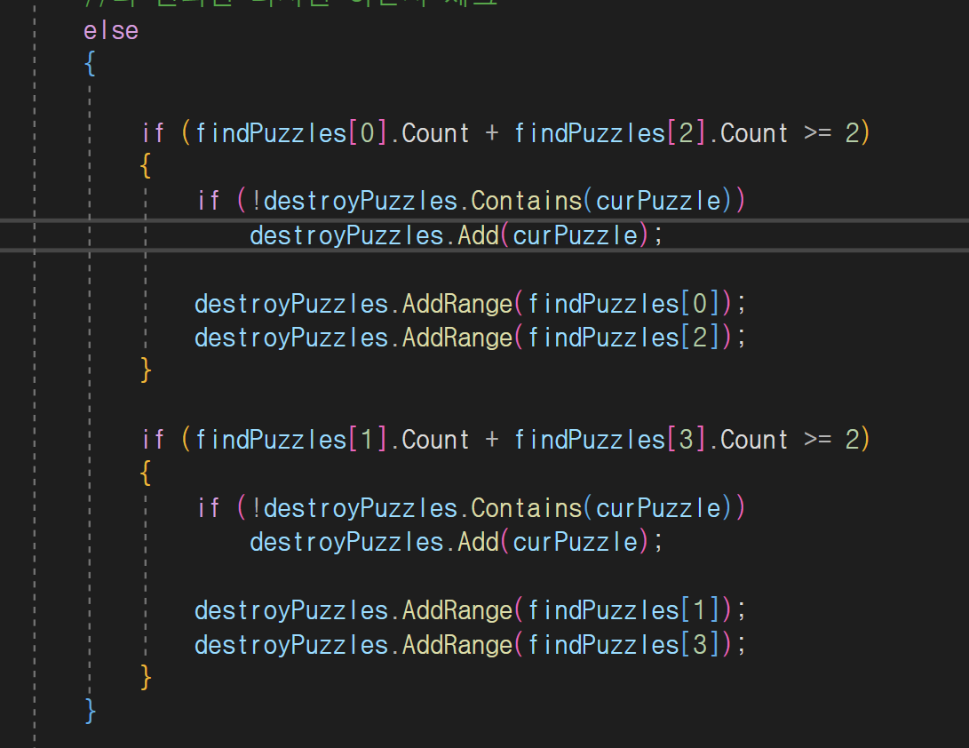 else if (!IsOutOfIndex(x, y + 3) && puzzles[x, y + 3].color == curpuzzle.color)