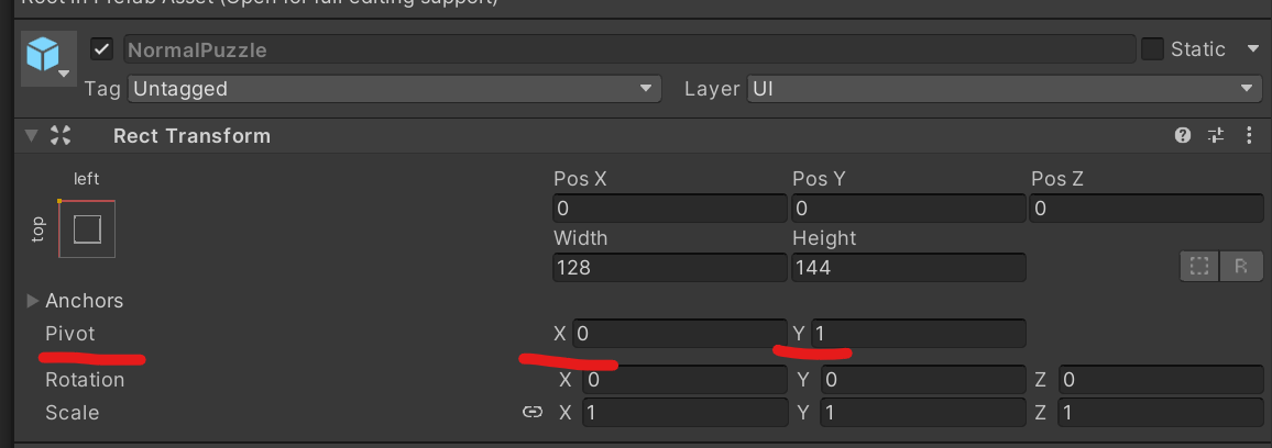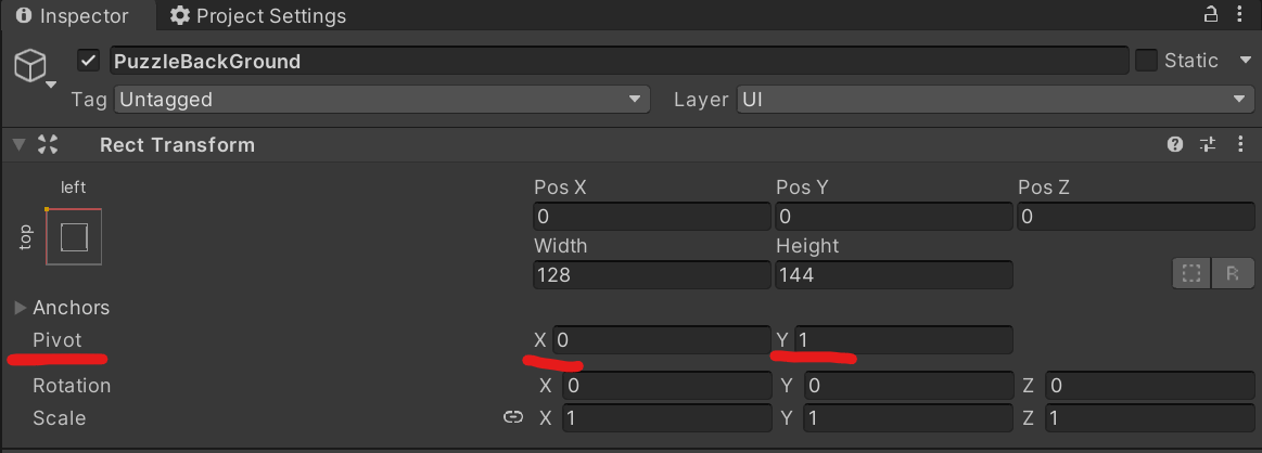 퍼즐 배경과 퍼즐의 프리펩에 있는 RectTrasform인데, 앵커와 피벗을 좌측 상단으로 설정해주고 진행을 해야한다.