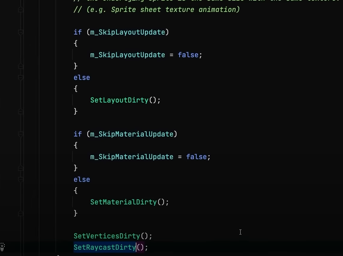 Image 클래스의 sprite 프로퍼티인데, Set을 살펴보면 스프라이트가 바뀌었을때 SetAllDirty함수가 실행되는것을 볼 수 있다.