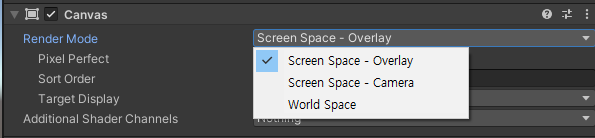 - 가장 간단한 렌더 모드. UI를 화면 상에 고정시키고자 할 때 주로 사용