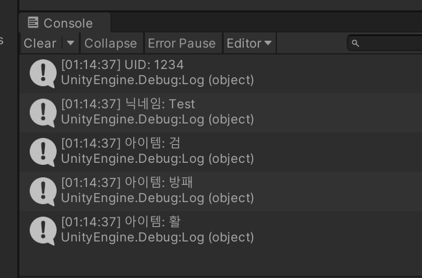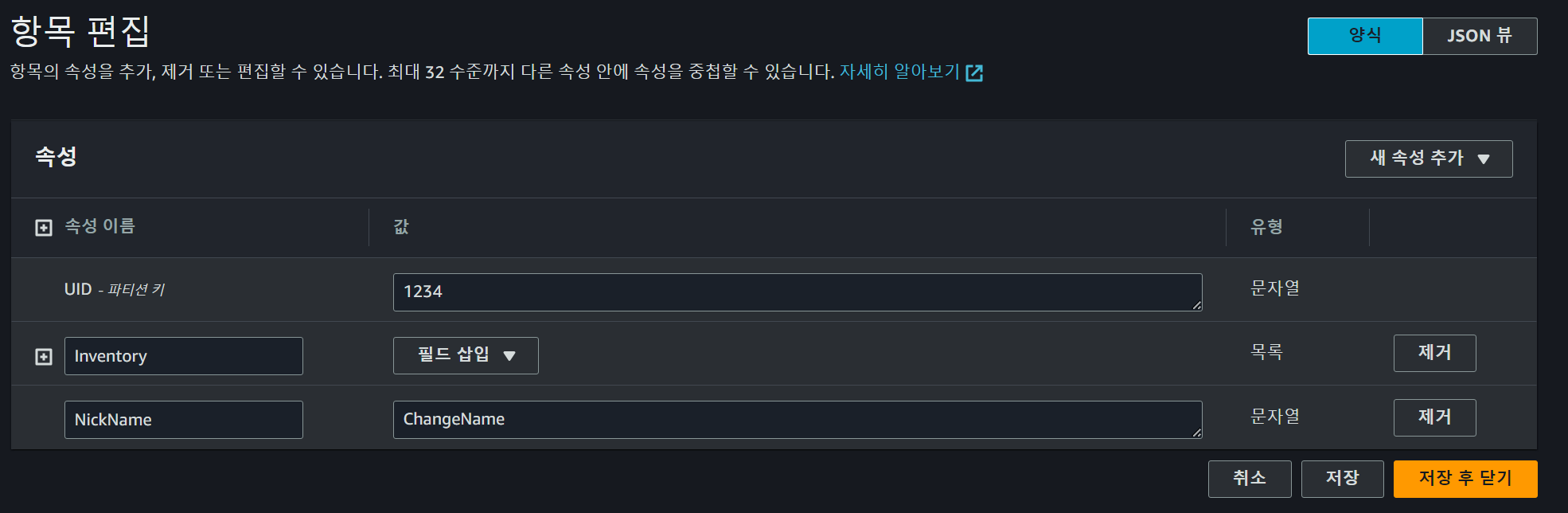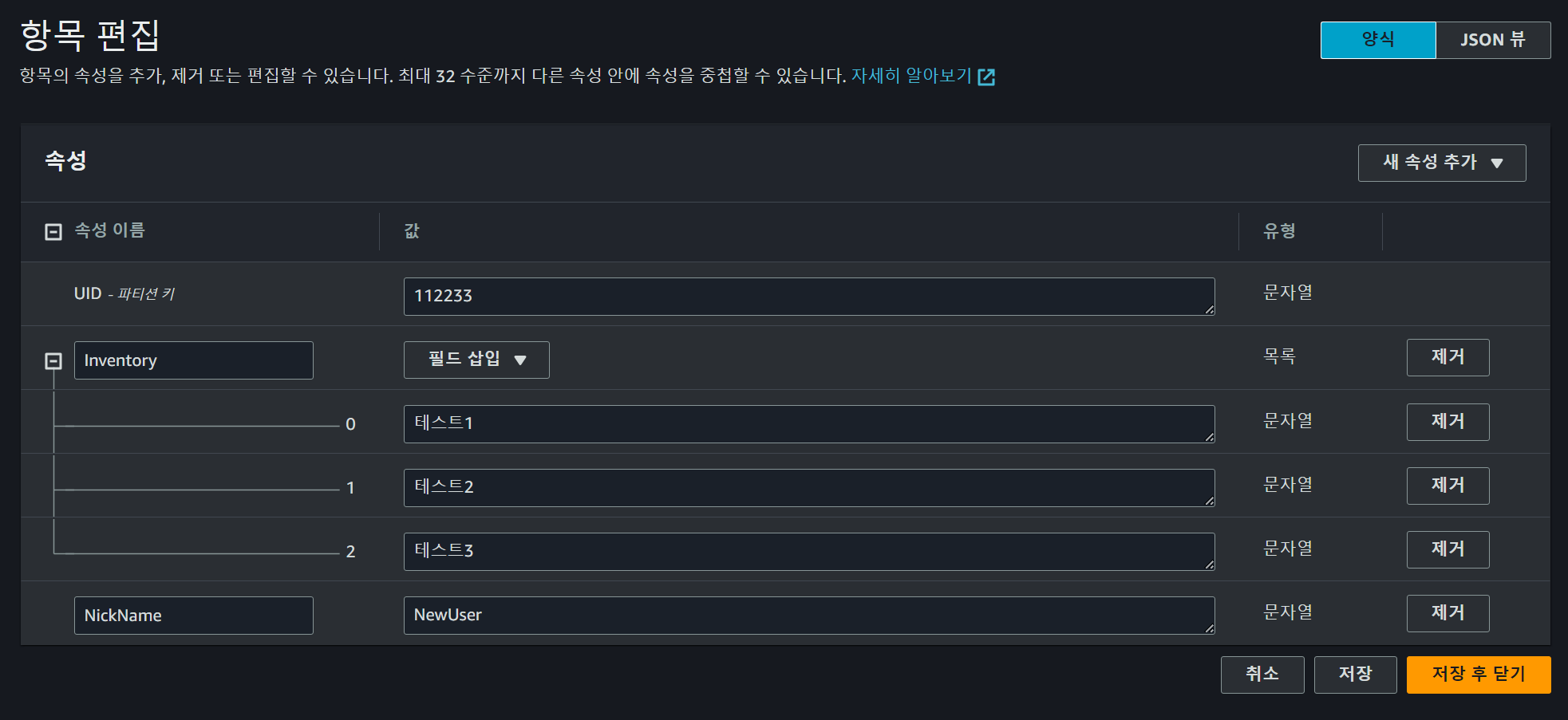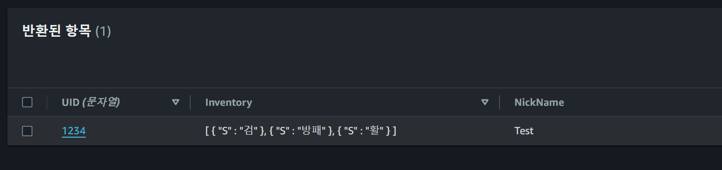 파티션키인 UID는 필수 입력이고, 그 외에 닉네임과 아이템을 넣어주었다.