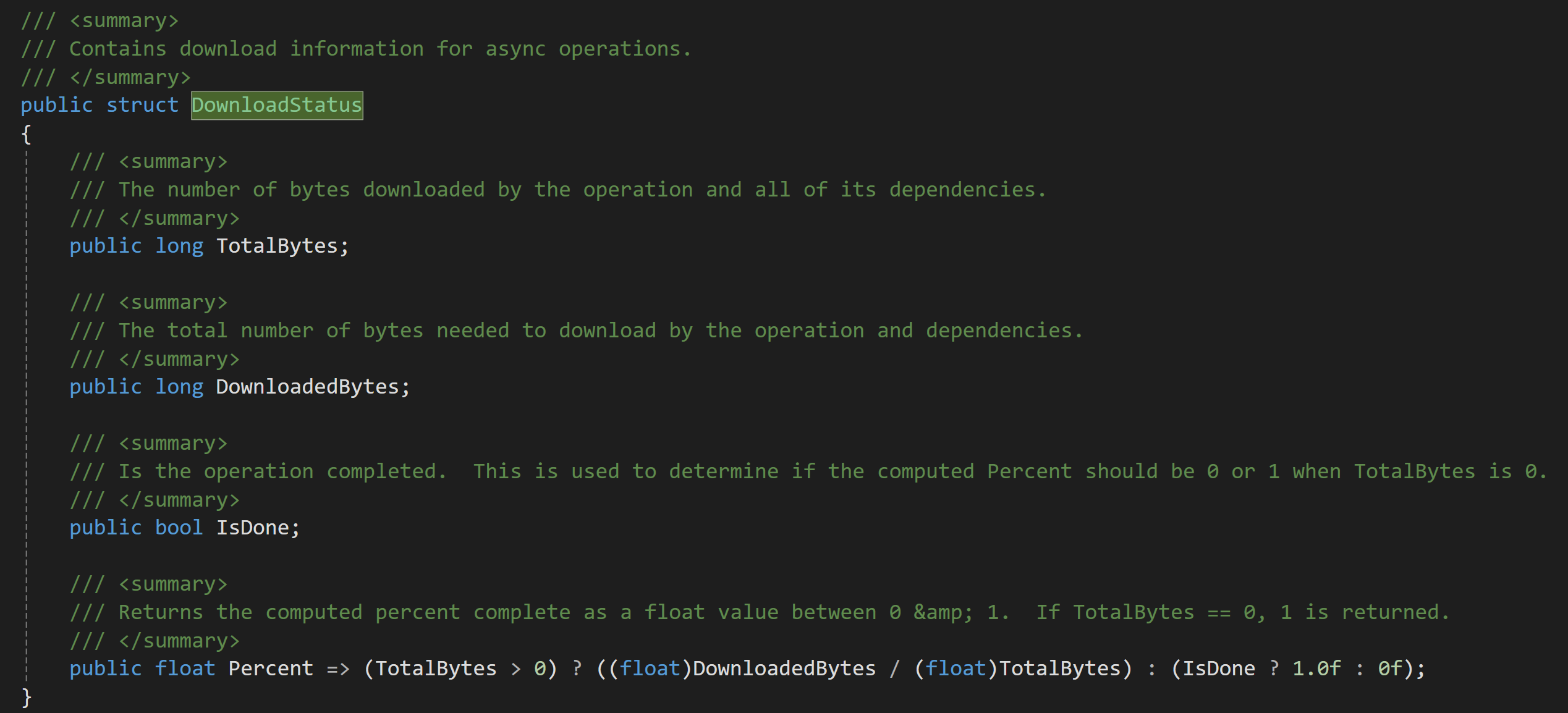 Debug.Log($"{downStatus.DownloadedBytes}/{downStatus.TotalBytes}");