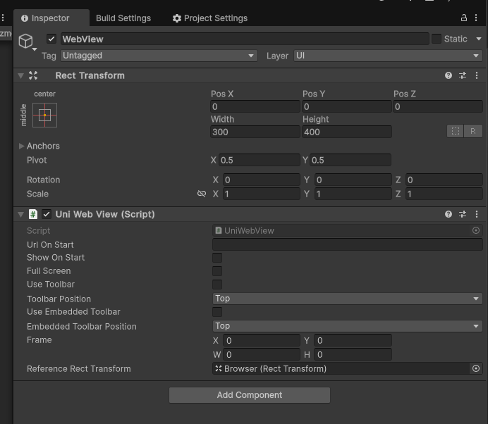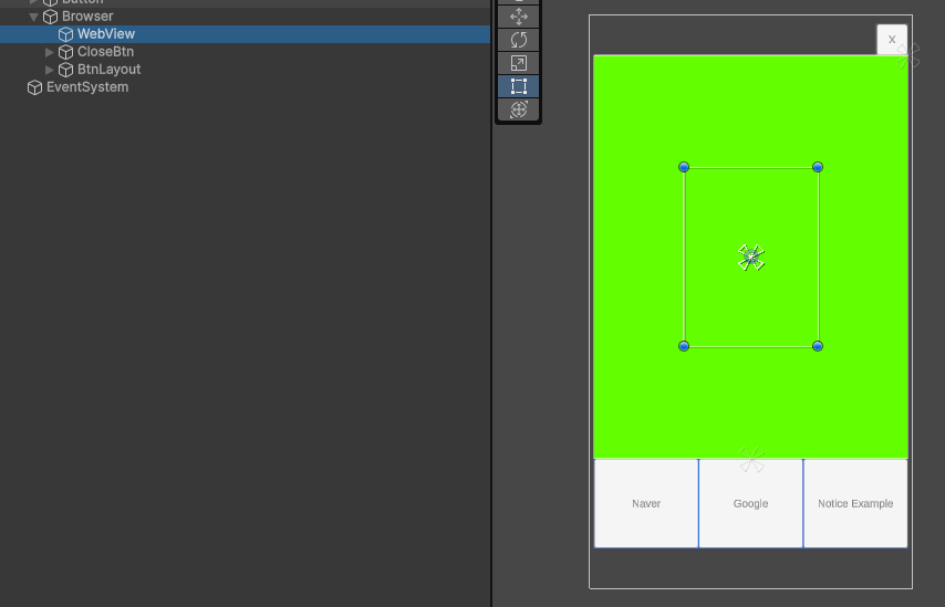 Reference Rect Transform에 웹뷰 사이즈를 맞춰야하는 UI를 넣어주면 알맞게 맞춰준다고해서 웹 뷰 부분은 일부러 부모인 브라우저의 사이즈와 맞추지 않았다.