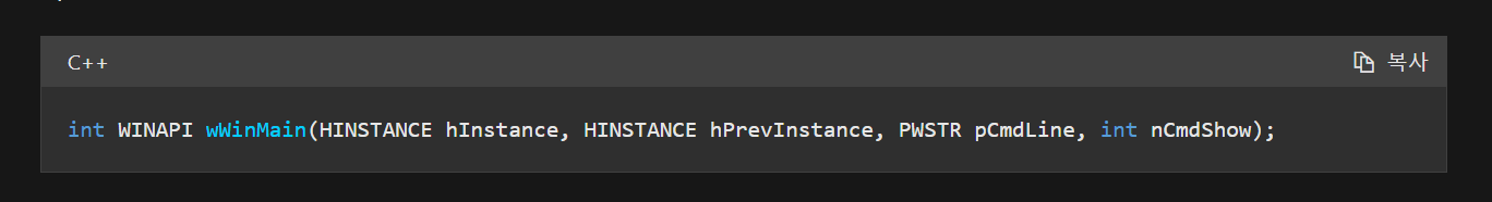 - hPrevInstance 는 아무 의미가 없습니다. 16비트 Windows 사용되었지만 지금은 항상 0입니다.