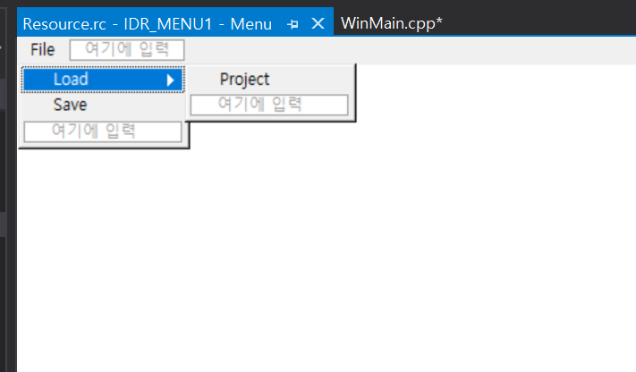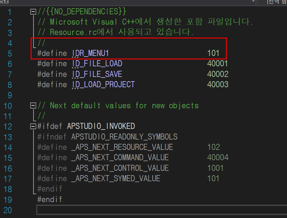 메뉴의 이름을 모르겠다면 아까 만든 resource.h로 들어가서 확인 가능하다.