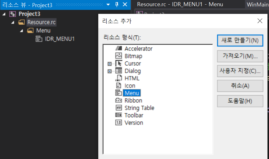 메뉴를 만들고 나면 MAKEINTRESOURCE로 아까 만든 메뉴를 넣어서 메뉴를 만들어 줄 수 있다.
