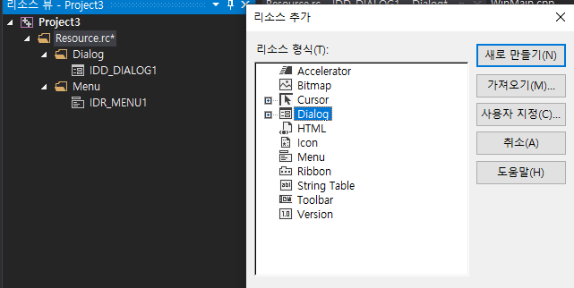 메뉴를 만들때와 똑같이 2번째 인자로 MAKEINTRESOURCE함수에 다이얼로그의 정의된 이름을 넣어주면 된다.