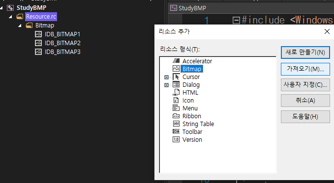 아까 다이얼로그의 리소스를 추가 시켜줬던 것 처럼 Bitmap을 클릭후 가져오기를 누른다.