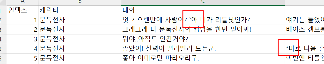 엑셀로 인덱스,캐릭터, 대화 내용을 적어서 csv파일로 만들었다.