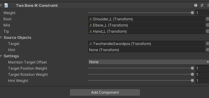 수업시간에 배운 방식으로 weight 1을 줘서 왼손을 IK로 칼에 붙여봤는데 만족스럽지가 않았다.