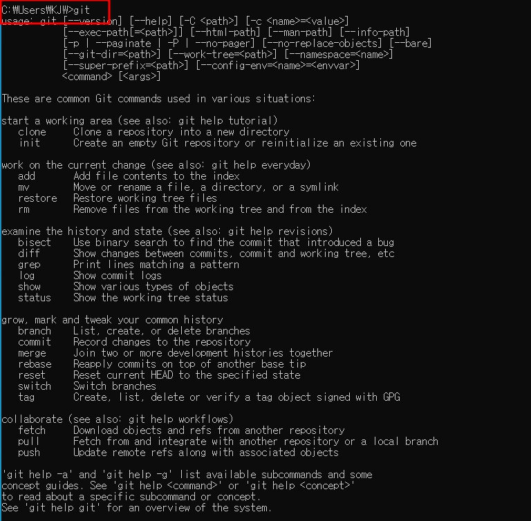 그 다음 git 을 입력해주면 밑에 명령어들이 주르륵 나온다