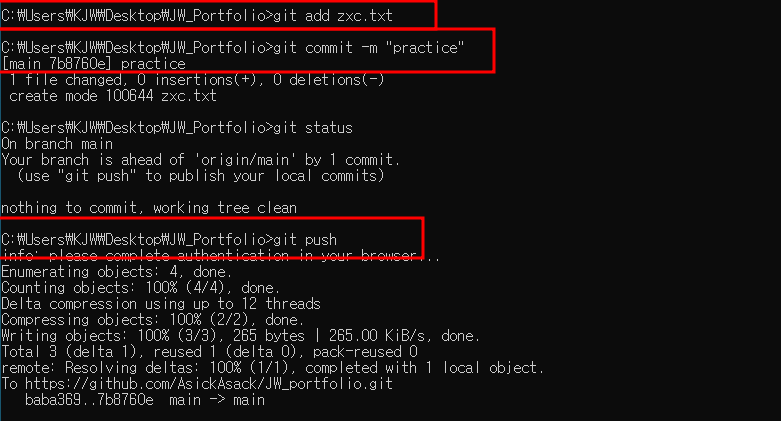아무튼 위 스샷에 보이듯이 zxc.txt파일을 add해주었고, practice라는 이름으로 커밋을 했다.