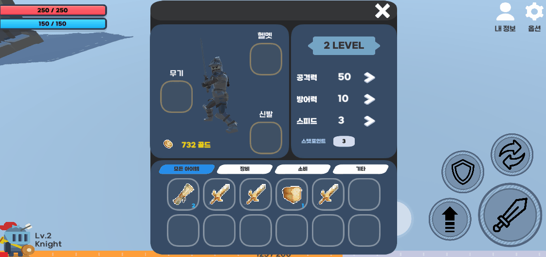 스텟도 바로 적용되며 ,장착을 하면 인벤토리 아이콘 좌측 상단에 장착 표시가 뜨게했다.
