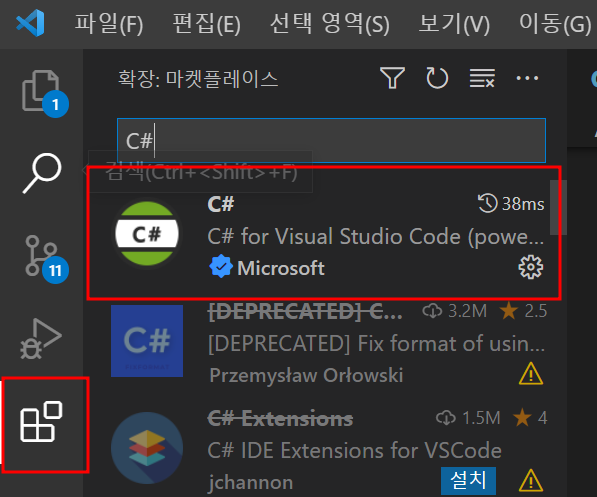 우리는 C#을 써야하니 마소가 올린 C#을 설치해준다.