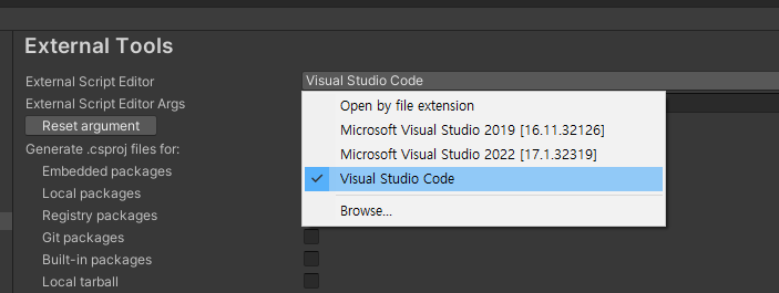 유니티에서는 Edit - Preferences - External Tools에서 External Script Editor를 비주얼 스튜디오 코드로 바꿔주면 끝이다.