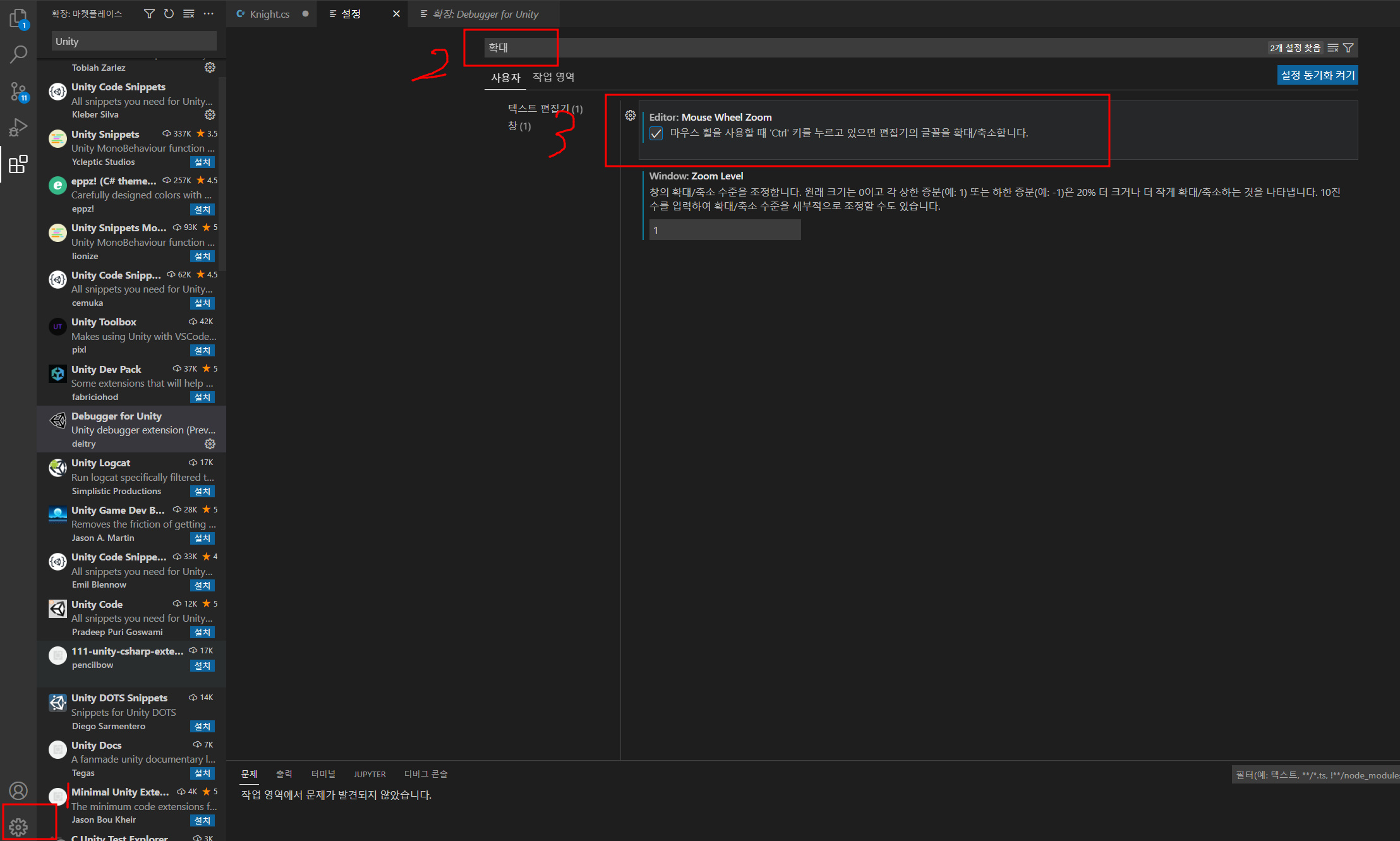 기존에 쓰던 비주얼 스튜디오는 컨트롤+마우스 휠을 돌리면 확대 축소가 되었는데 코드는 안된다.