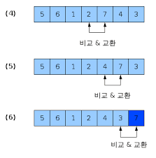 (ex. {6,3,2,1} -> 6,3 비교 6 이더 큼 (스왑) / 6,2 비교 6 이더 큼 (스왑), 마지막 6,1비교 6 이더 큼 (스왑))
