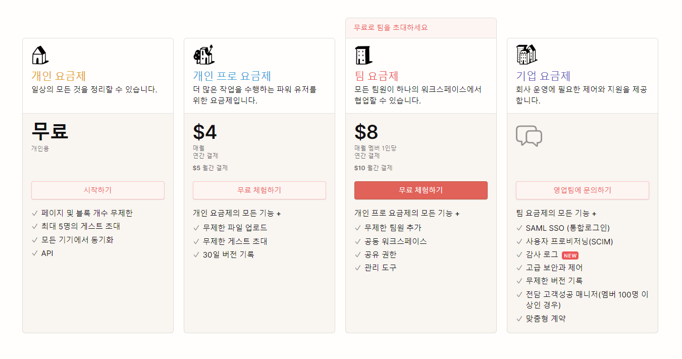 2기기 까지만 연동이 무료인 에버노트와 다르게 노션은 개인 무료 요금제도 괜찮았다.
