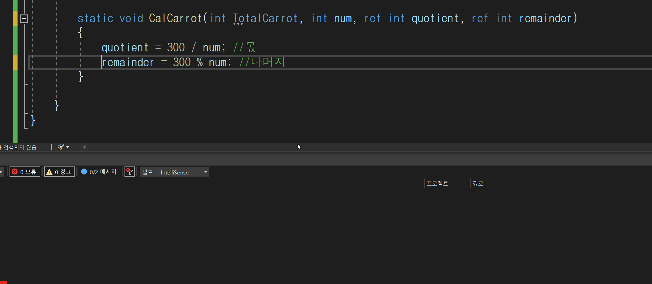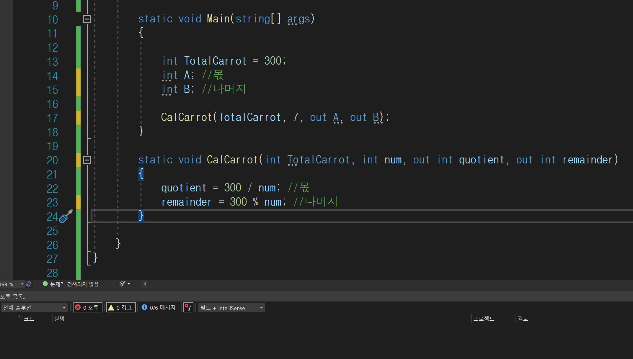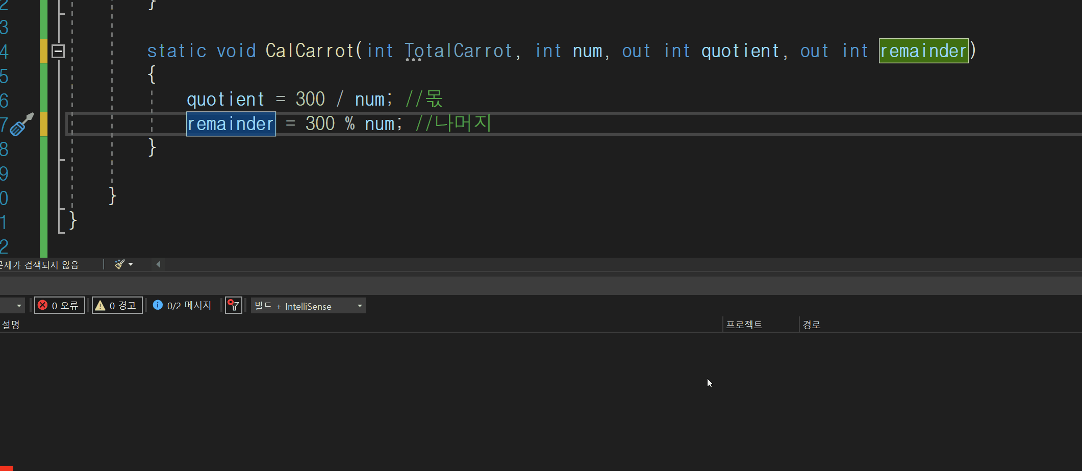 아래 움짤을 보면 Out으로 넘긴 매개변수 remainder에 값을 넣어준 코드를 주석처리 하면 '제어가 현재 메서드를 벗어나기 전에 'remainder' out 매개 변수를 할당해야 합니다.' 라는 에러메세지를 낸다.