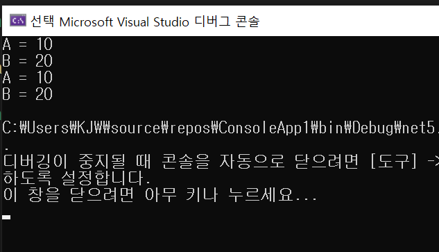 Console.WriteLine($"변경 후\n{A}\n{B}");