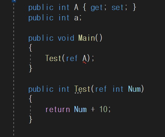 프로퍼티를 ref 한정자를 이용하여 인수로 넘기면 '속성 또는 인덱서는 out 또는 ref 매개 변수로 전달할 수 없습니다' 라는 오류를 낸다.