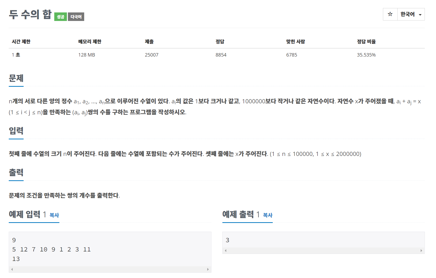 백준 3273번 - 3273번: 두 수의 합 (acmicpc.net)